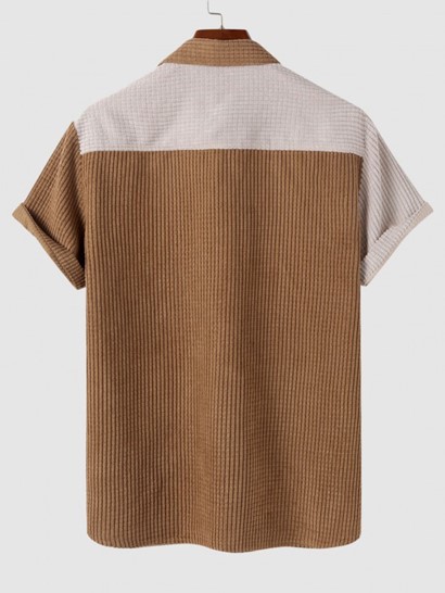 Colorblock Front Pocket Corduroy Short Sleeves Shirt And Drawstring Shorts Set