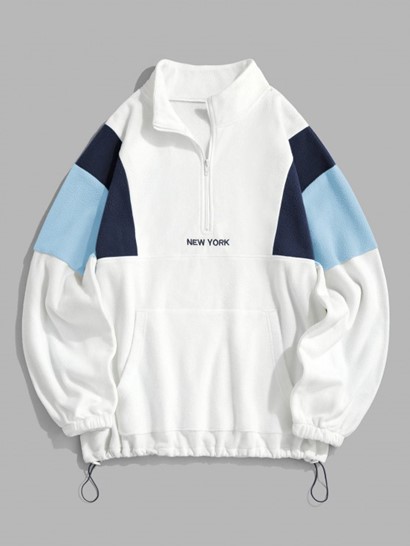 Fluffy Polar Fleece NEW YORK Embroidery Colorblock Half Zip Sweatshirt With Drawstring Jogger Cargo Pants Set