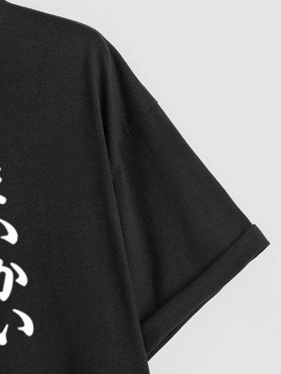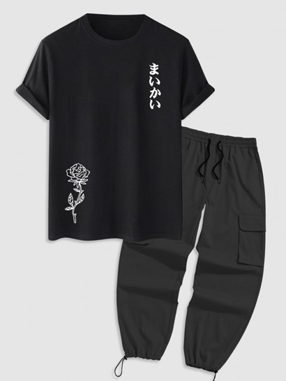 Japanese Rose Graphic Printed Short Sleeve T-shirt With Drawstring Ankle Cargo Pants Set