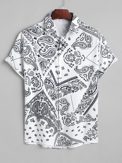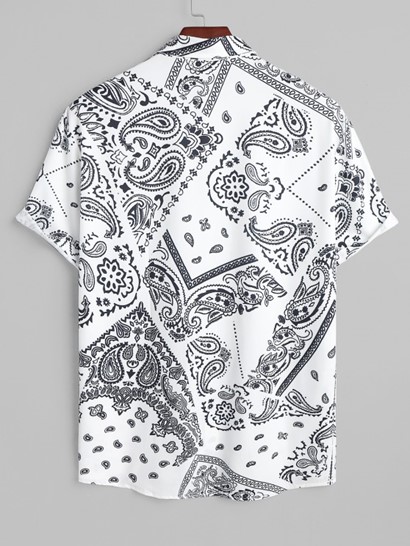 Men’s Beach Vacation Ethnic Paisley Floral Patchwork Scarf Print Button Up Short Sleeve Shirt And Drawstring Pocket Bermuda Shorts Set