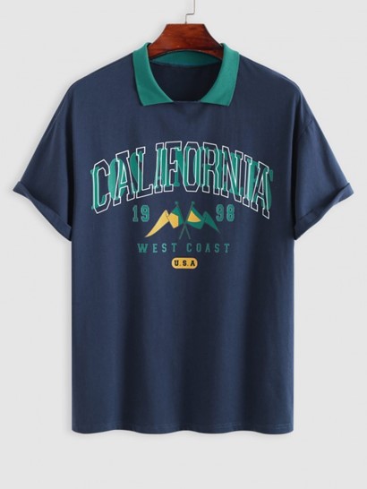 Men’s CALIFORNIA WEST COAST Flag Pattern Short Sleeves Polo Collared T-shirt And Label Design Solid Color Drawstring Shorts Set