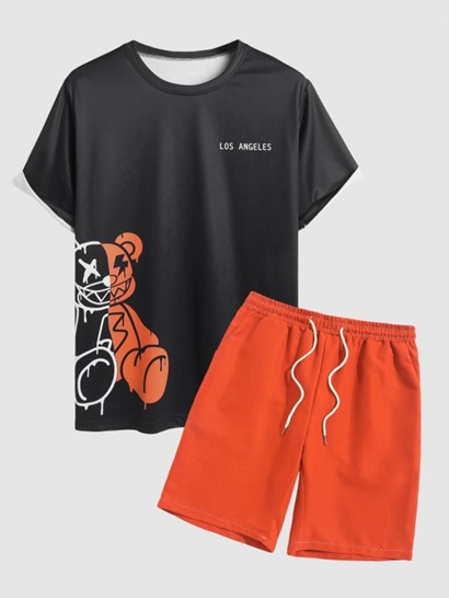 Men’s Casual Two Piece Set LOS ANGELES Letter Cartoon Bear Graphic Pattern Short Sleeves Round Neck T-shirt With Solid Color Basic Shorts Set