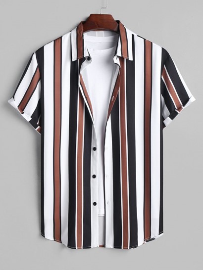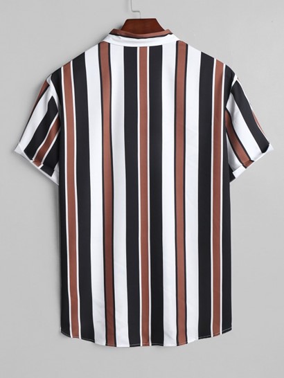 Men’s Daily Casual Mix And Match Two Piece Set Vertical Stripes Button Up Short Sleeve Shirt With Drawstring Bermuda Shorts Set