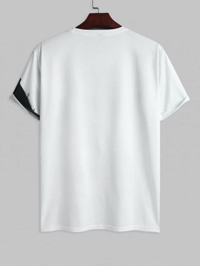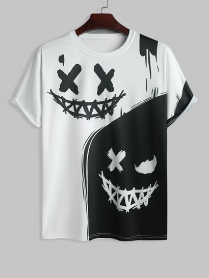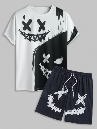 Men’s Evil Smile Face Print Colorblock Two Tone Crew Neck Casual Short Sleeve T Shirt And Streetwear Cartoon Drawstring Board Shorts Set