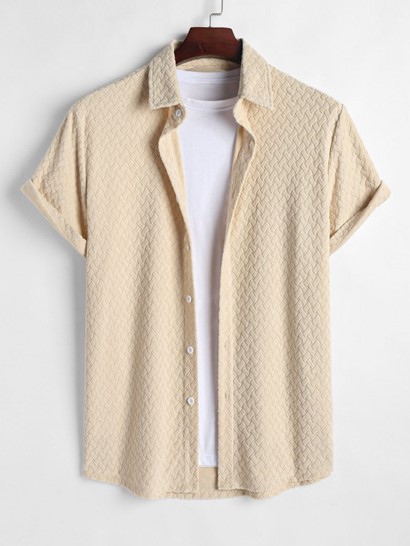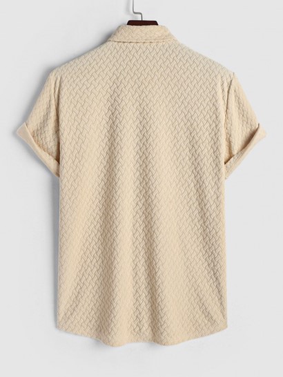 Men’s Geometric Jacquard Terry Cloth Short Sleeves Casual Summer Shirt And Drawstring Pocket Plain Corduroy Textured Shorts Set