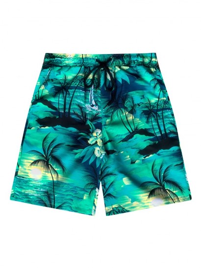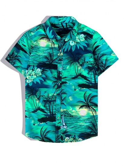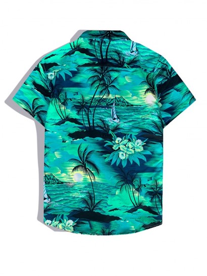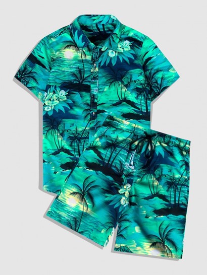 Men’s Hawaiian Coconut Trees Sun Printed Button Front Short Sleeves Shirt And Drawstring Shorts Vacation Beach Set