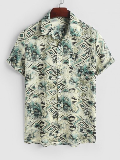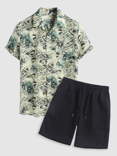 Men’s Mix And Match Two Piece Set Geometric Snake Printed Short Sleeves Shirt With Solid Color Basic Casual Shorts Set