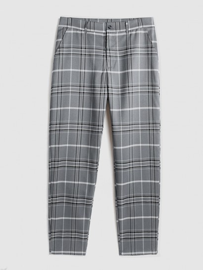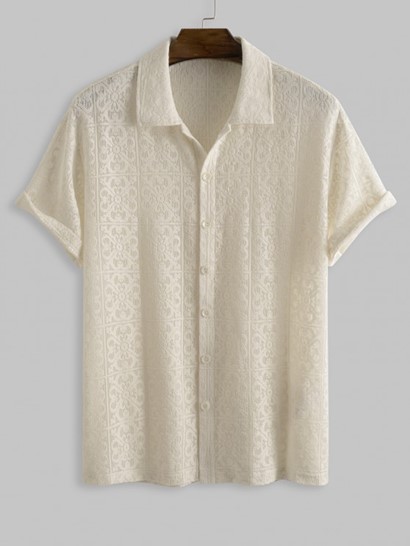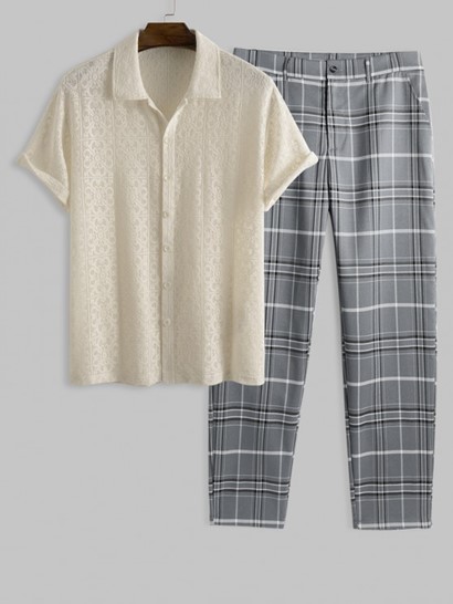 Men’s Sexy Floral Jacquard See-through Lace Sheer Openwork Short Sleeves Shirt And Plaid Pattern Zip Fly Casual Pants Set
