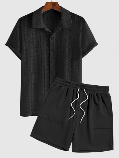 Men’s Sexy Lace Sheer Openwork Short Sleeves Button Front Shirt And Basic Solid Color Drawstring Sweat Shorts Set