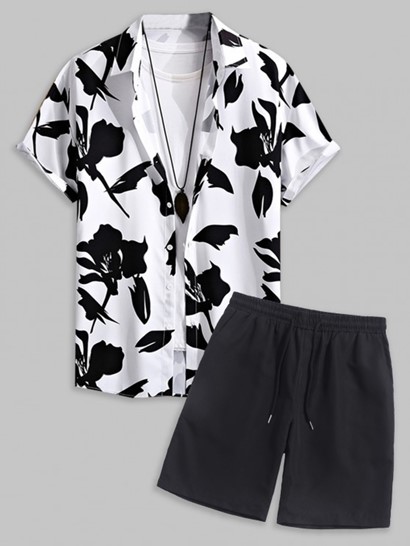 Men’s Summer Beach Monochrome Floral Print Button Up Short Sleeve Shirt And Solid Color Basic Casual Bermuda Shorts Vacation Set