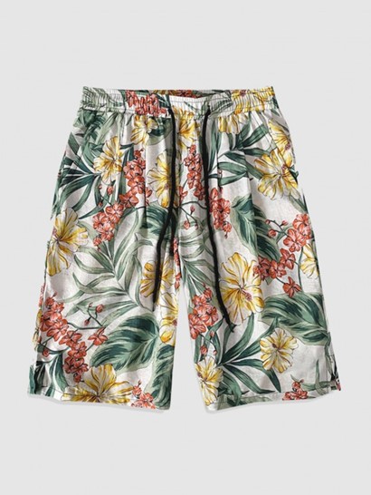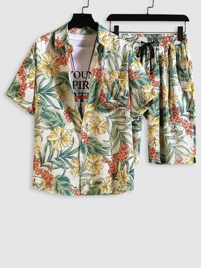 Men’s Summer Beach Vacation Matching Co Ord Tropical Leaves Plant Floral Print Short Sleeves Front Pocket Two Piece Hawaii Shirt And Drawstring Pockets Bermuda Shorts Set