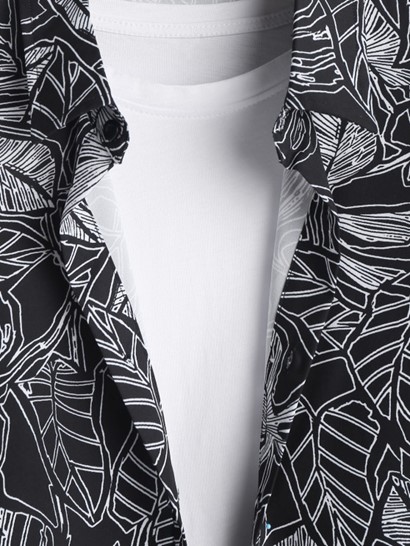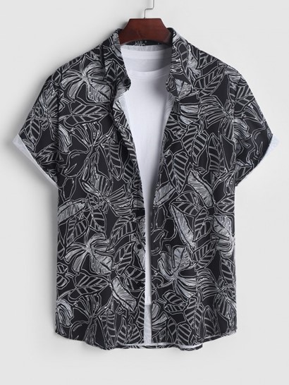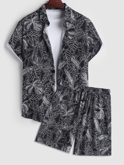 Men’s Two Piece Summer Vacation Beach Leave Print Button Up Short Sleeves Shirt And Drawstring Pockets Bermuda Shorts Set