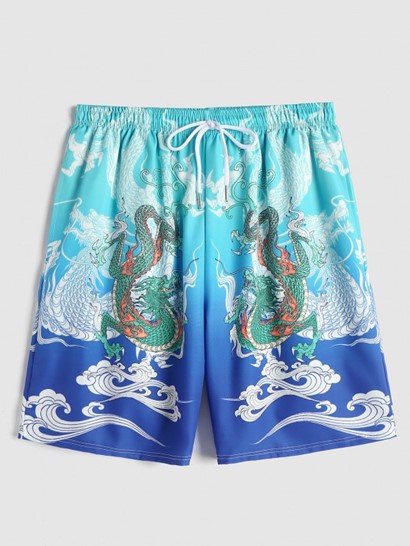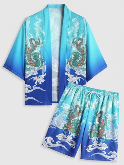 Men’s Vacation Beach Co Ord Chinese Style Dragon Cloud Pattern Open Front Kimono With Drawstring Board Shorts Set