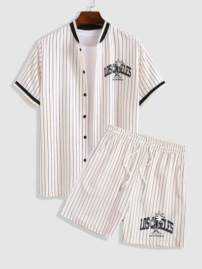 Men’s Vertical Stripes LOS ANGELES Letter Coconut Tree Pattern Short Sleeves Button Front Baseball Shirt And Drawstring Board Shorts Vacation Hawaiian Beach Set