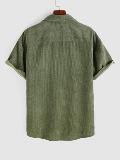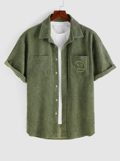 Smile Face Embroidered Pocket Corduroy Shirt And Drawstring Ankle Cargo Pants Set